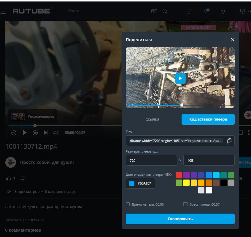 4. Скопируйте код вставки плеера («Поделиться» → «Код вставки плеера»).